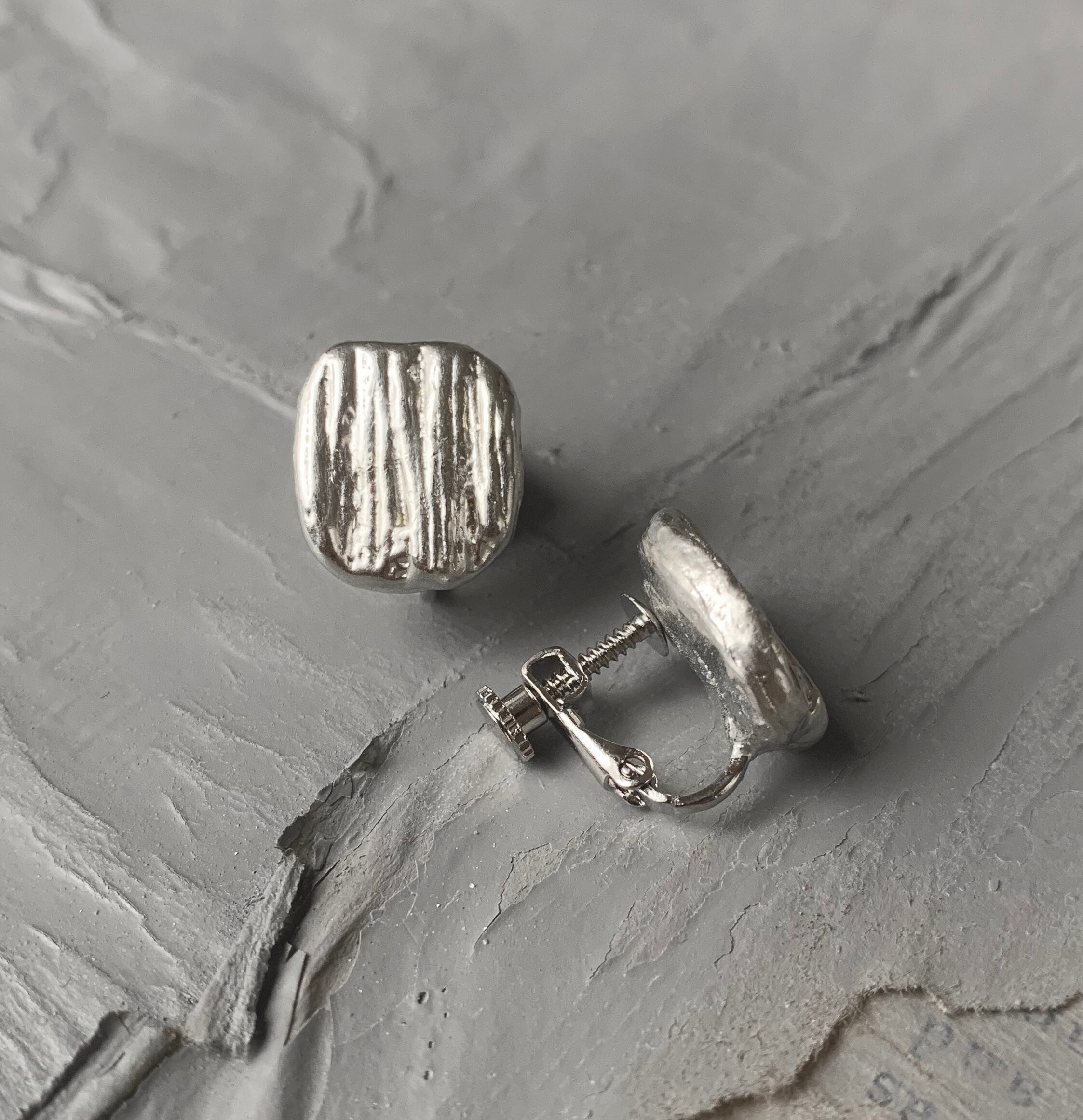 立体的な縦縞模様が特徴の錫のイヤリングです。