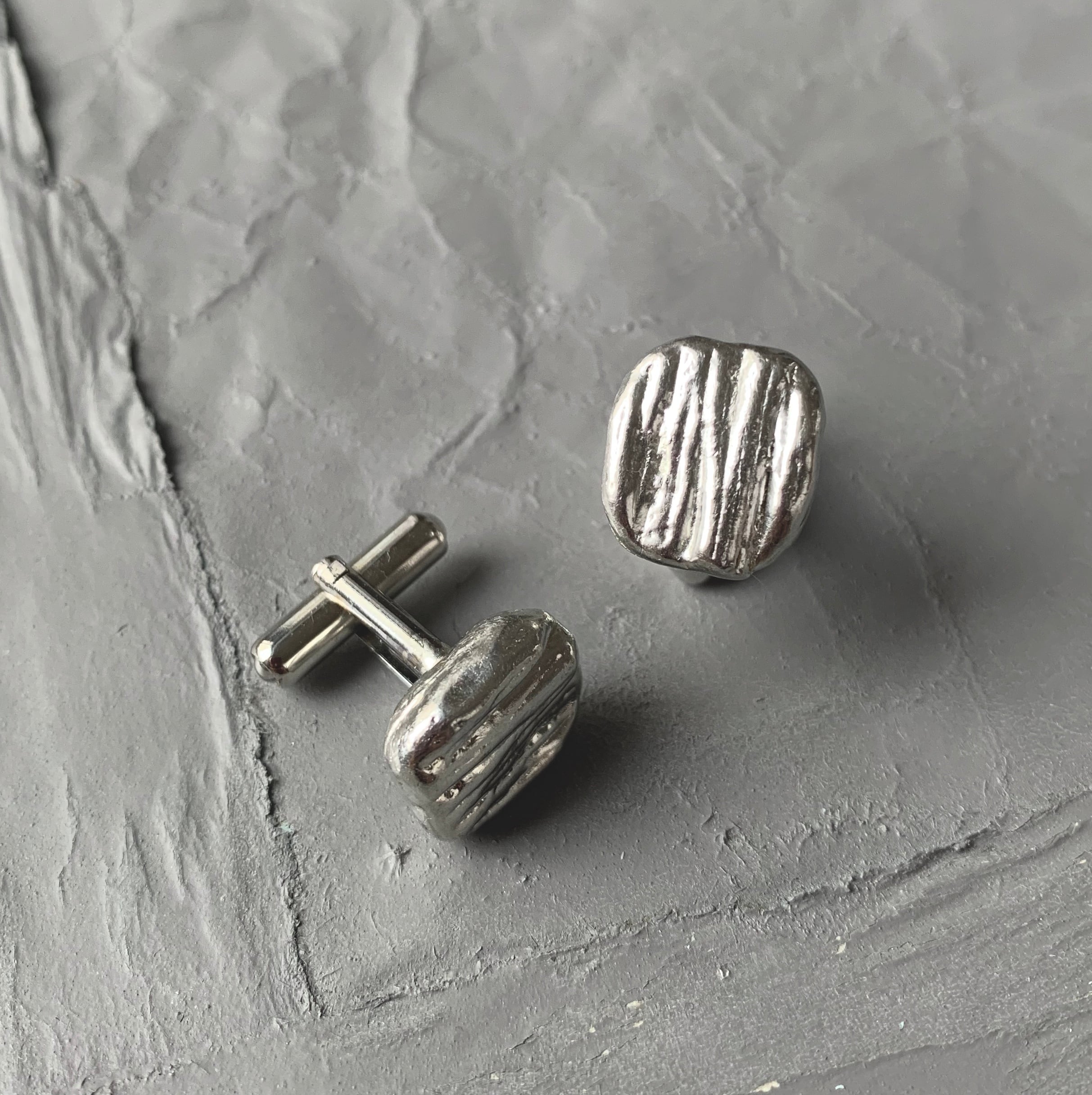 立体的な縦縞模様が特徴の錫のカフスボタンです。