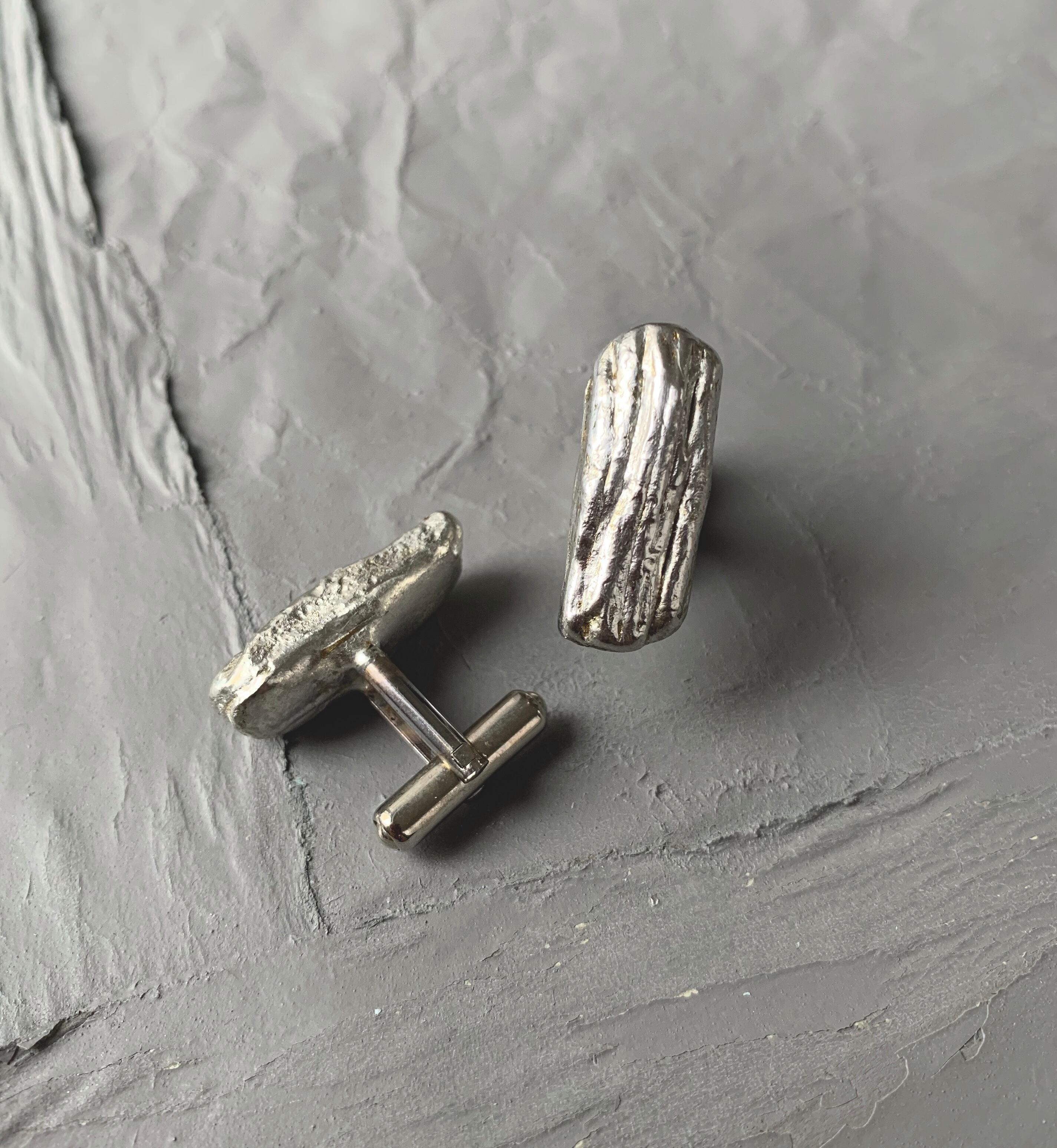立体的な縦縞模様と細長い形が特徴の錫のカフスボタンです。
